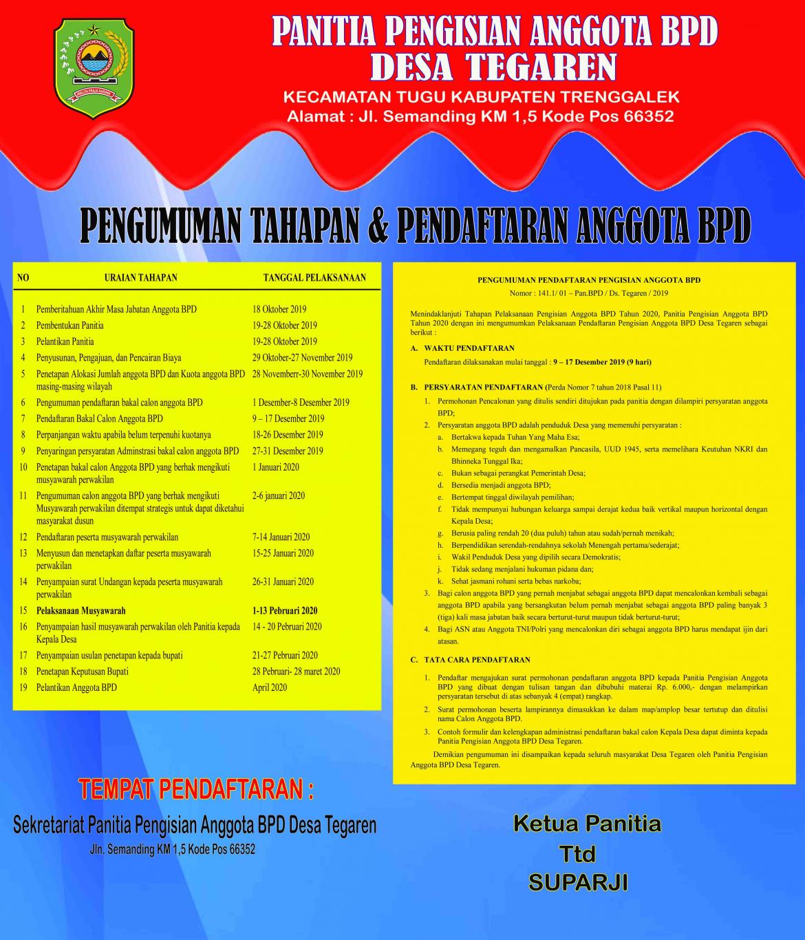Seiring telah selesainya tugas dari Badan Permusyawaratan Desa (BPD) pada tahun 2020, kali ini Pemerintah Desa Tegaren Kecamatan Tugu Kabupaten Trenggalek mengadakan rapat persiapan serta membentuk dan melantik panitia untuk pengisian BPD tersebut, Senin (28/10). Musyawarah ini adalah sebagai tahapan awal guna menyukseskan gelaran dalam mengisi BPD periode tahun 2020 sampai 2026.