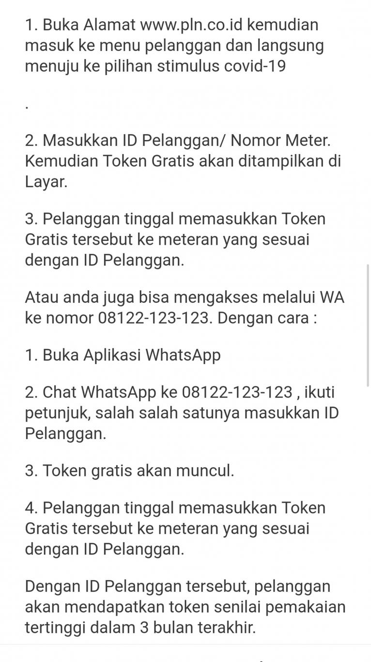 Pelanggan dapat memperolehnya dengan mengirimkan Nomor ID pelanggan atau nomor meter melalui website PLN (www.pln.co.id). Dengan mengirimkan ID atau nomor meter tersebut pelanggan akan mendapatkan token senilai pemakaian tertinggi dalam 3 bulan terakhir untuk pelanggan 450 VA dan sebesar 50% akan diberikan kepada pelanggan 900 VA yang bersubsidi (R1T) dihitung dari pemakaian bulanan tertinggi dalam 3 bulan terakhir. Semoga bermanfaat untuk kita semua.
