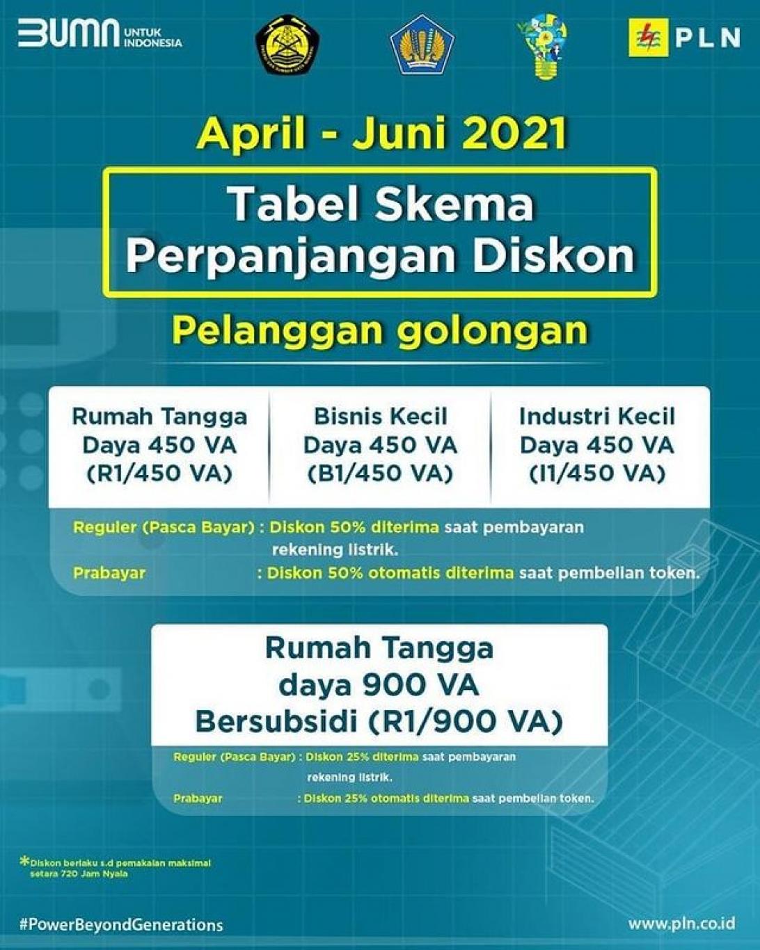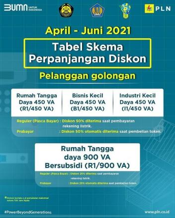 Pemerintah memutuskan untuk memperpanjang periode pemeberian stimulus listrik bagi pelanggan golongan 450 volt ampere (VA) dan 900 VA subsidi hingga Juni 2021. Namun mulai April hingga Juni mendatang pemerintah melakukan penyesuaian terhadap mekanisme penyaluran stimulus listrik gratis tersebut. Kementerian Energi dan Sumber Daya Mineral (ESDM) menyatakan, mulai April ini besaran stimulus yang diterima pelanggan 450 VA dan 900 VA subsidi masing-masing dipotong 50 persen.